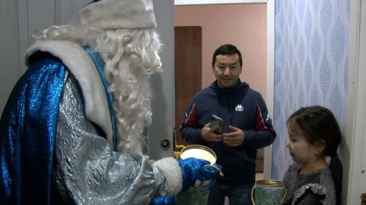 Дедушка Мороз поздравил детей врача выездной патронажной бригады неотложной медицинской помощи для осмотра пациентов на дому с Covid-19 Мергена Иргита. Волшебник вручил им сладкие подарки и пригласительные билеты для всей семьи на новогодний спектакль, который пройдет 3 января в ДК «Строитель».